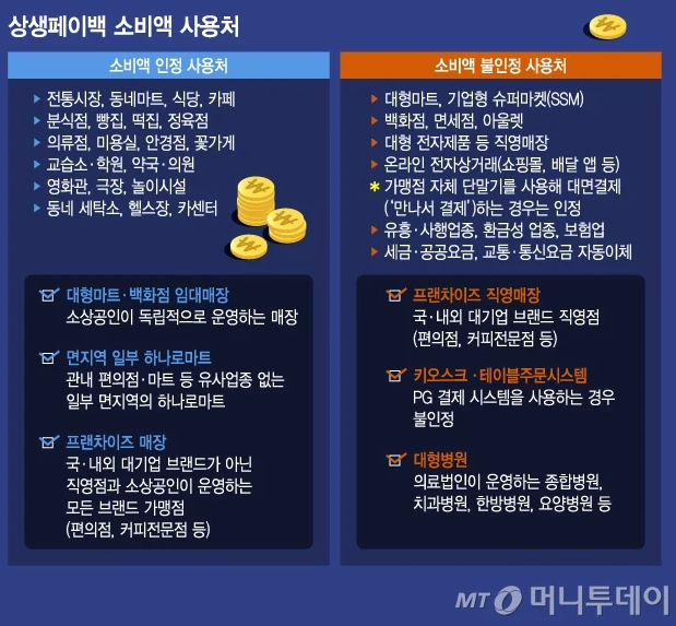 - 사용처는 전통시장, 동네 슈퍼, 식당, 학원, 약국, 미용실 등 중소·소상공인 매장 위주고, 연 매출 30억 원 넘는 중형 슈퍼마켓이나 제과점도 포함됩니다